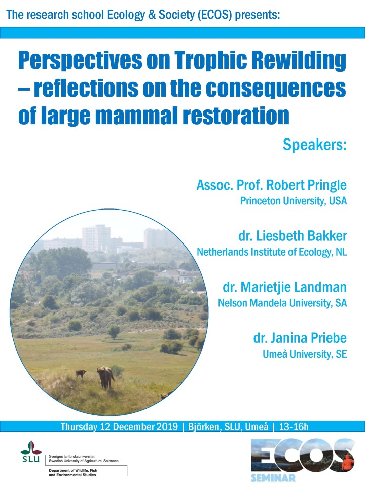 In a series of four talks, researchers from different parts of the world will present examples and their views on the benefits and challenges associated with trophic rewilding from ecological, social and economic perspectives. All welcome!